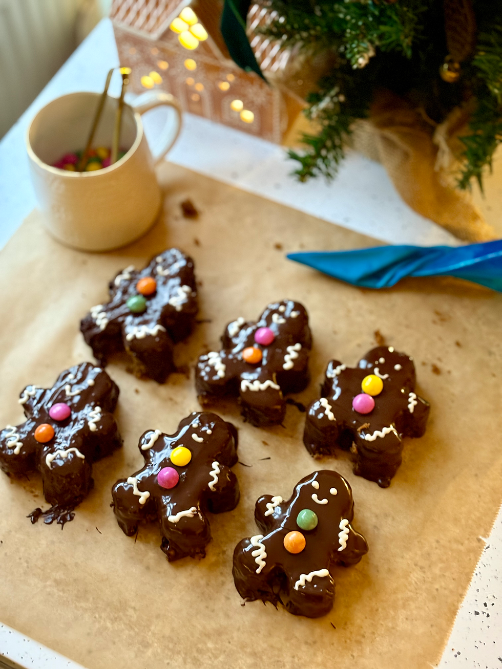 Gently place the chocolate covered gingerbread person cake on the baking paper to set and repeat, covering all the sponge shapes in the melted chocolate