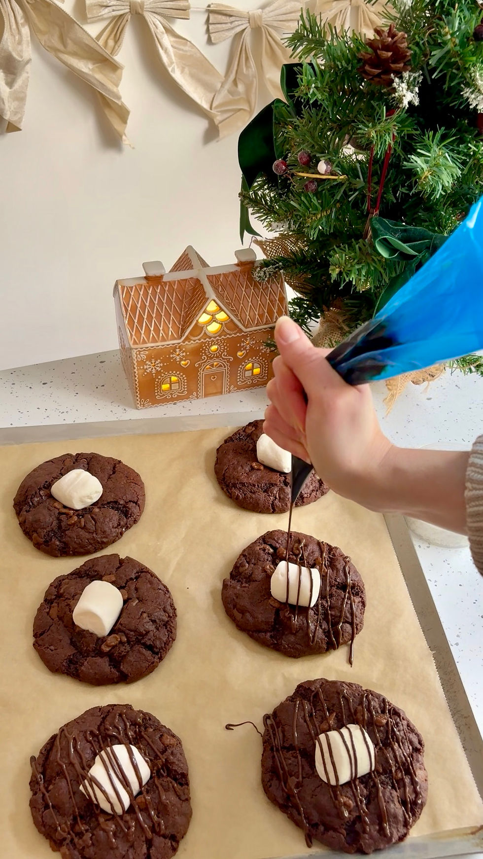 Thick chocolatey cookies filled with chocolate chips and giant marshmallow and festive sprinkles.