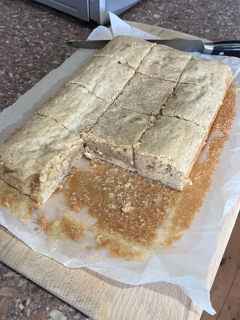 Bake for 25-35 minutes. The blondie is baked when the edges are firm and the top has lightly ‘crusted’ but there is still a slight jiggle to the middle of the tin