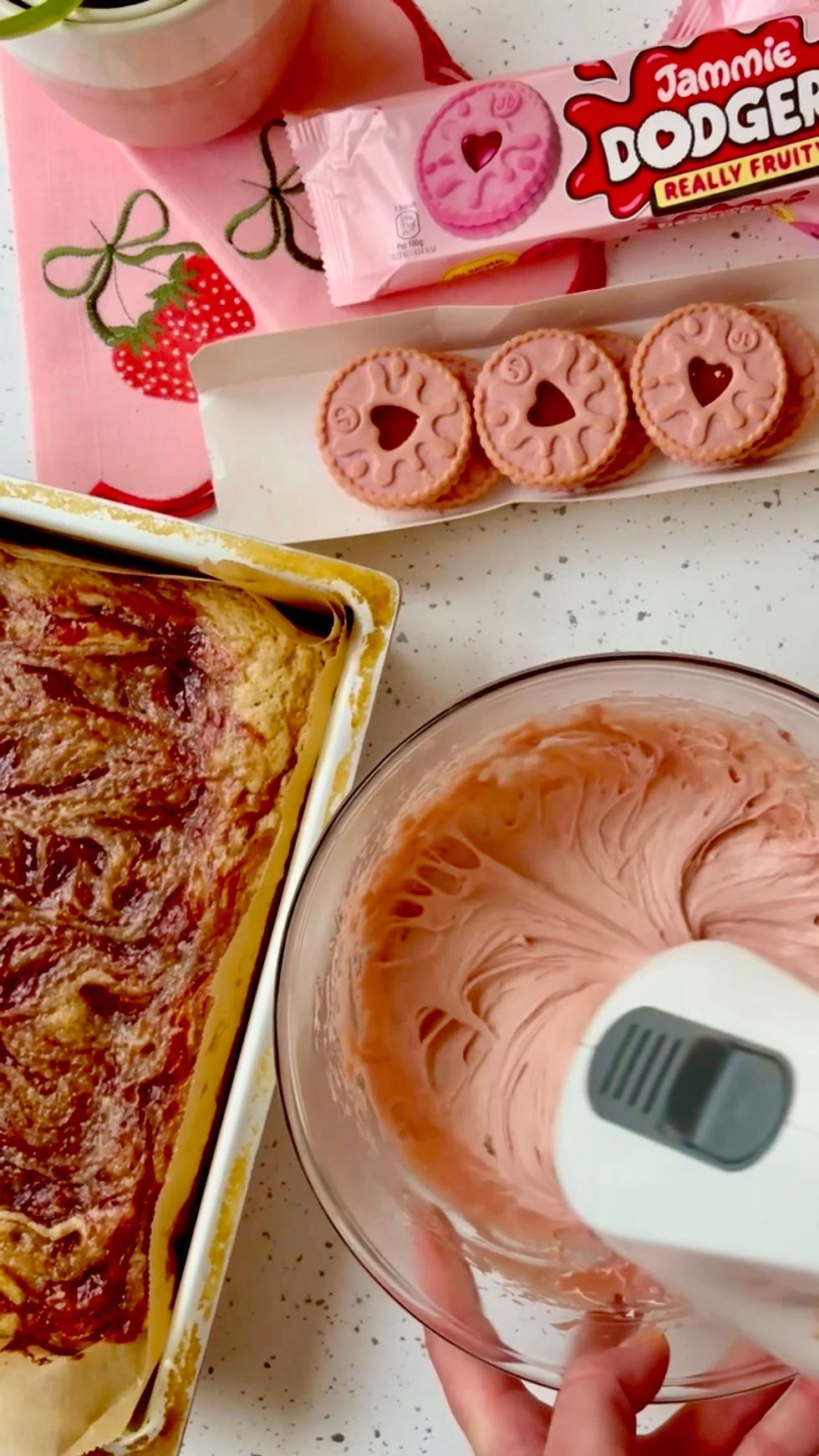 A delicious layered blondie, with a pink strawberry Jammie Dodger base, strawberry jam swirled blondie and naturally pink, strawberry ganache topping!